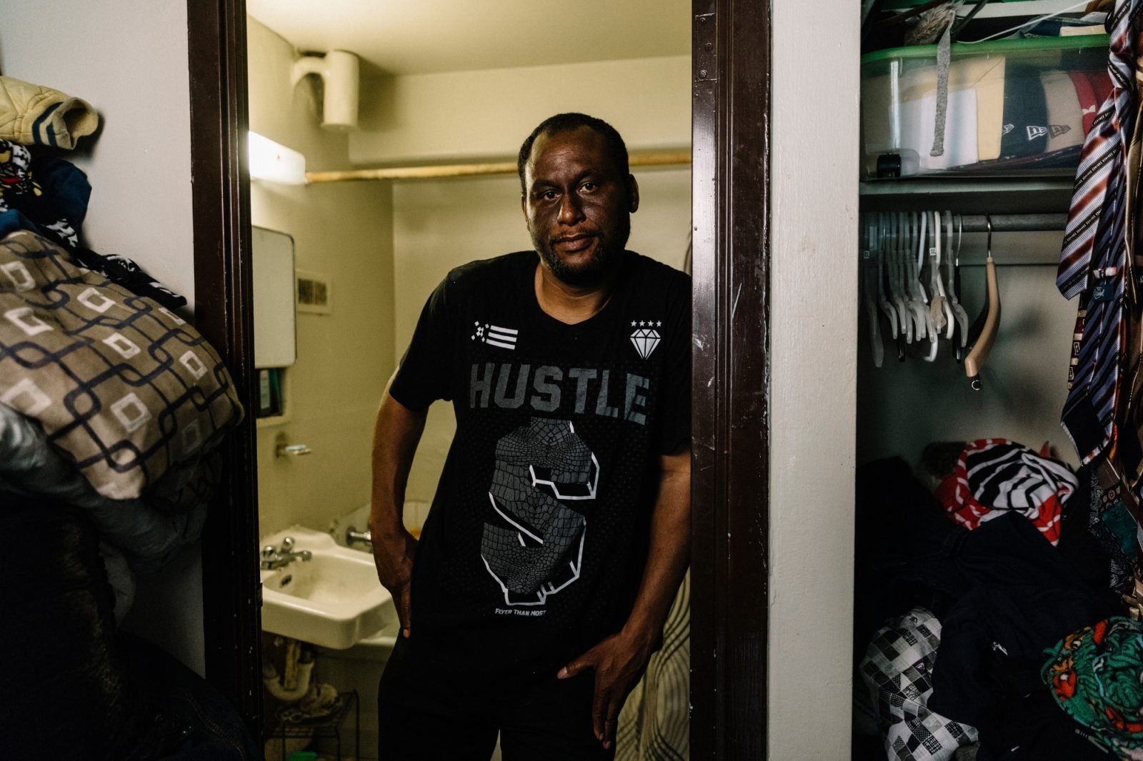 Terrell Wren stands in his bathroom in the Orr-Weathers Apartments. (William Widmer, special to ProPublica)