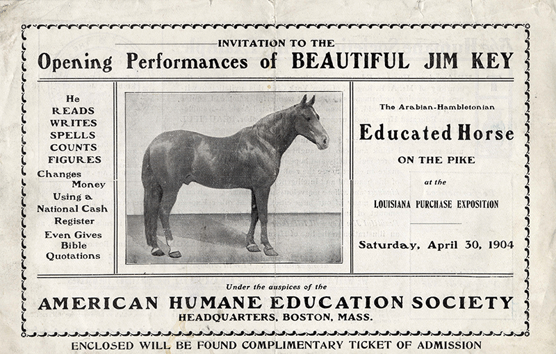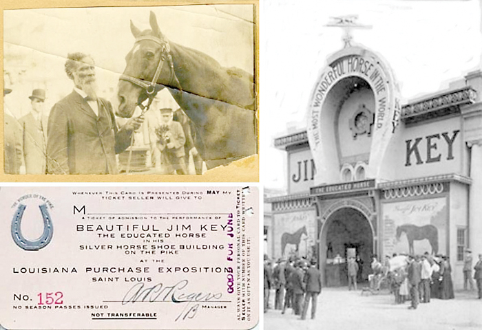 The Beautiful Jim Key exhibit was one of the first shows to open at the beginning of the St. Louis World's Fair and was a popular top moneymaker. William Key performed in front of then-President Teddy Roosevelt's daughter, Alice. Jim Key spelled Alice's name- “Alice Roosevelt Longworth,” adding the surname of her escort.