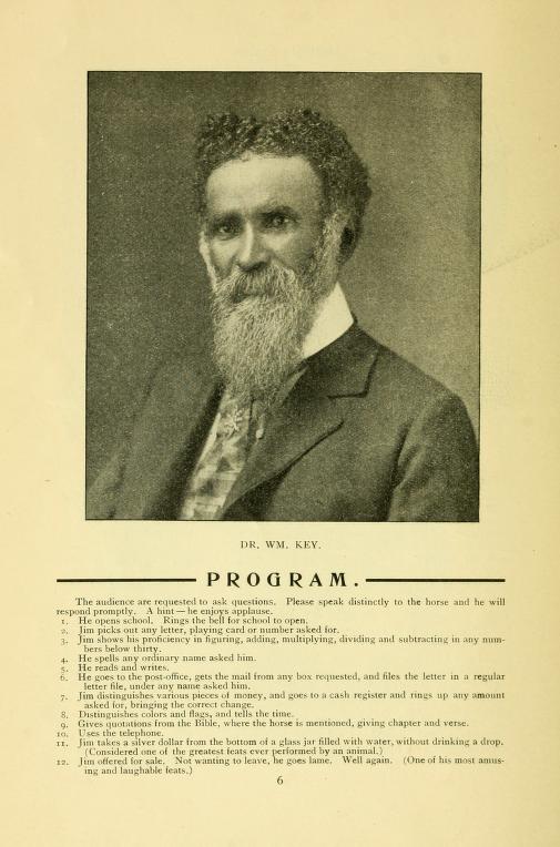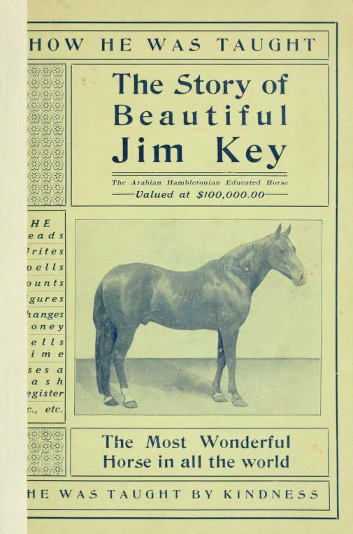 Key put Jim on a rigorous training routine that lasted for seven years. When finally exhibited, Beautiful Jim Key could read, write on a blackboard, spell, do math, distinguish among coins and make change, identify playing cards, play a hand-organ, tell time, sort mail, cite biblical passages and respond to political inquiries, among other amazing feats.