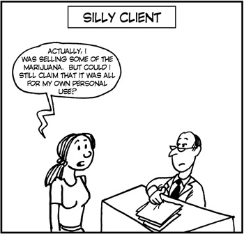 In the cartoons above, the silly client told her lawyer that she was selling marijuana. So if that client testifies in court that she didn’t sell any of it, her lawyer may be required to snitch. The smart client did not officially tell her lawyer that she was selling marijuana. But she successfully alerted her lawyer to the matter a way that will allow them to discuss the legal issues involved.
