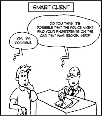 In the cartoons above, the silly client admitted to his lawyer that he touched the car. So if that client testifies in court that he didn't touch the car, the lawyer may be required to snitch. The smart client answered his lawyer’s question very precisely, giving his lawyer enough information to plan the defense strategy, without limiting his own testimony.