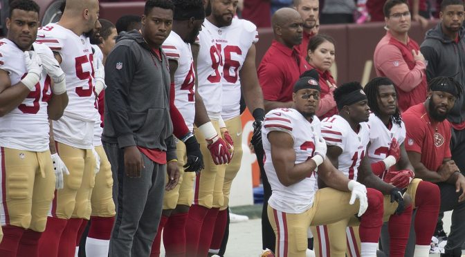 Last season, during the playing of the national anthem, dozens of NFL players kneeled, locked arms and raised their fists in protest against police and state-sanctioned violence inflicted upon African-Americans. Their actions elicited a fierce backlash, much of it fueled by President Donald Trump, who encouraged his overwhelmingly white base of supporters to boycott the NFL so long as players, in his view, continued to disrespect the flag. Seeking to avoid further controversy, on May 23, Commissioner Roger Goddell announced that for the upcoming season, “All team and league personnel on the field shall stand and show respect for the flag and the Anthem.” Not following this directive could result in teams being fined and players subject to “appropriate discipline.”