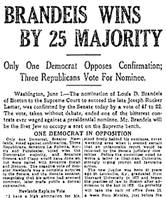 Louis D. Brandeis’ nomination in 1916 led to a bitter partisan brawl infused with anti-Semitism. One witness at his confirmation accused him of “infidelity,” and another characterized Brandeis as “duplicitous”.