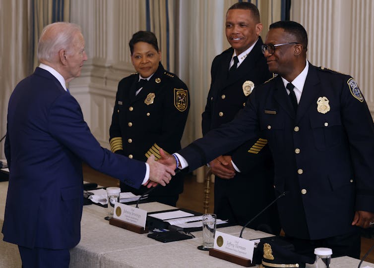 During the meeting, President Joe Biden lauded investments made in law enforcement and community anti-violence initiatives during his administration. In 2023, Biden said, the U.S. “had one of the lowest rates of all violent crime in more than 50 years.”