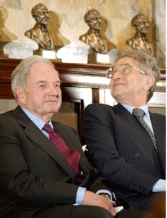 George Soros, right, eyed the busts of Andrew Carnegie on a mantel, as he sat with the late David Rockefeller in 2001 when they were among the first recipients of the Carnegie Medals of Philanthropy. AP Photo/Richard Drew