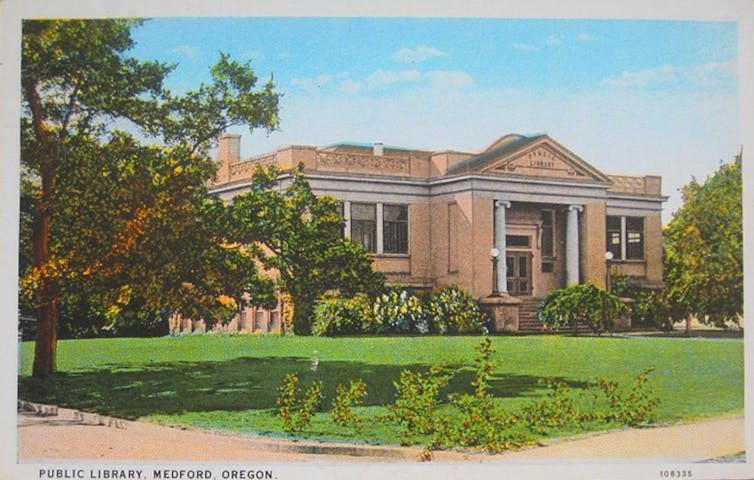 The Medford, Oregon public library, depicted in this postcard, is a classic example of Carnegie library architecture. Offbeatoregon.com